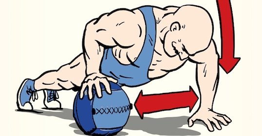 - How: Place one hand on the ball and the other on the ground. Perform a push-up. Switch hands each rep or after a set.