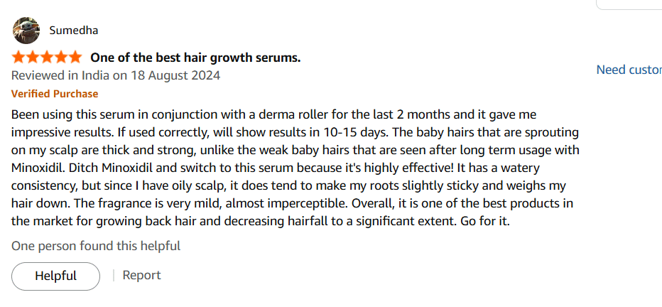 - Another user: “I have thinning of hair in the crown area. It has been a month I have been using this and trust me, I have started to see baby hair.” Amazon India