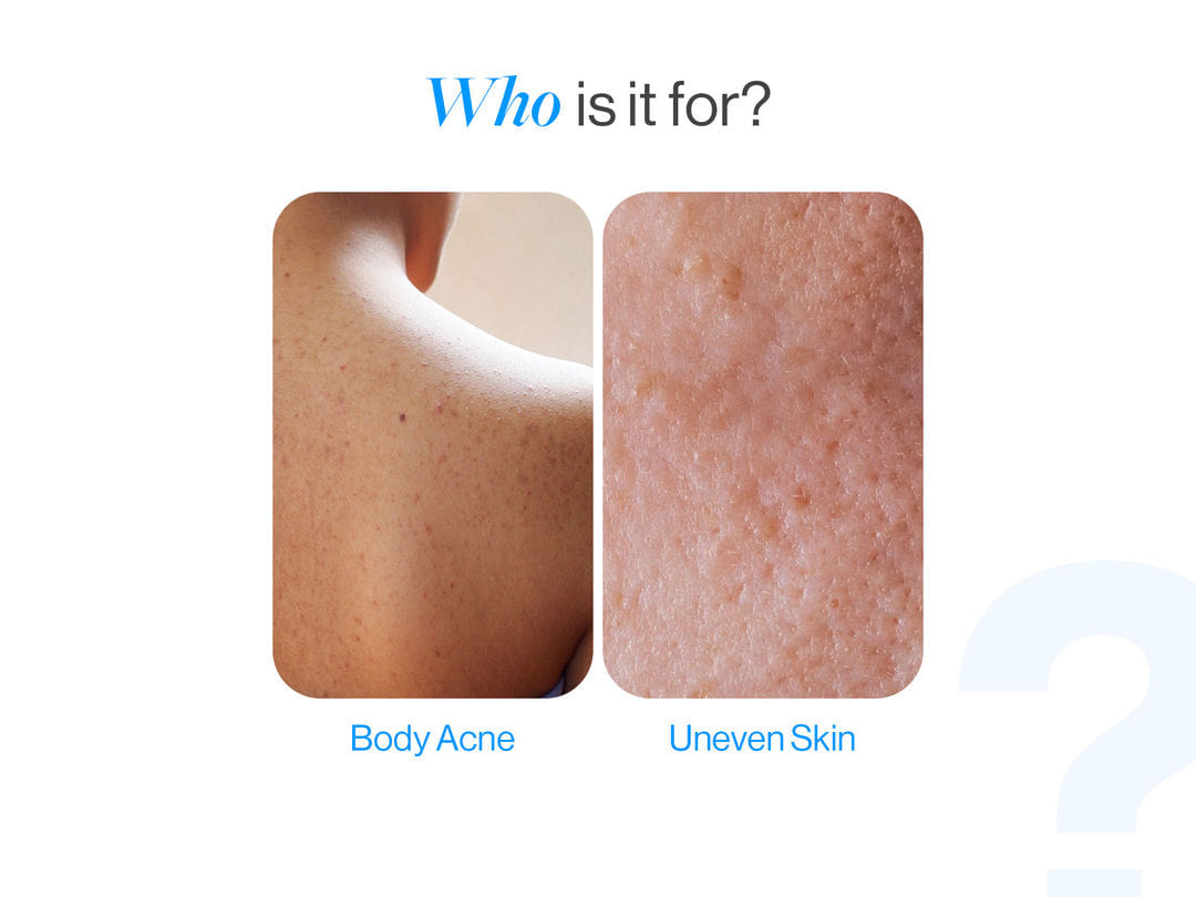 - Salicylic acid at 1% — effective for body acne without being overly aggressive