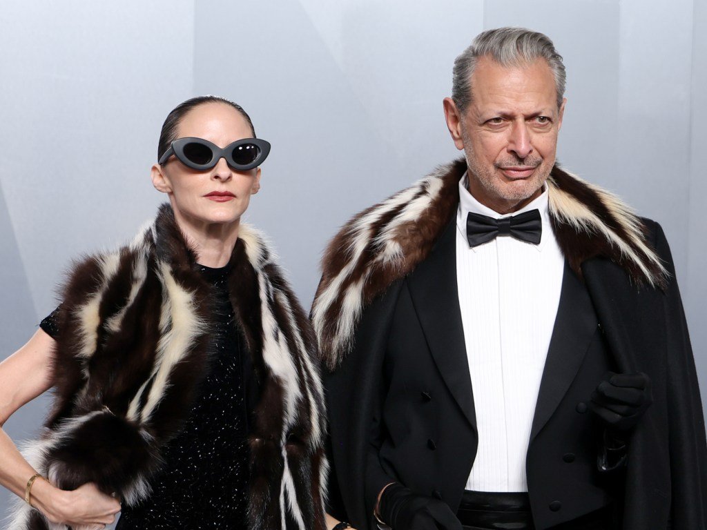 The Canadian dancer, 43, wore a glittery bodysuit with a thong and a high-leg slit that showed off her long legs in semi-sheer tights. She styled the look with black sunglasses and a dramatic fur scarf, which matched her husband’s collar. Goldblum, 73, wore a black coat over wide-leg pants and a cropped blazer.