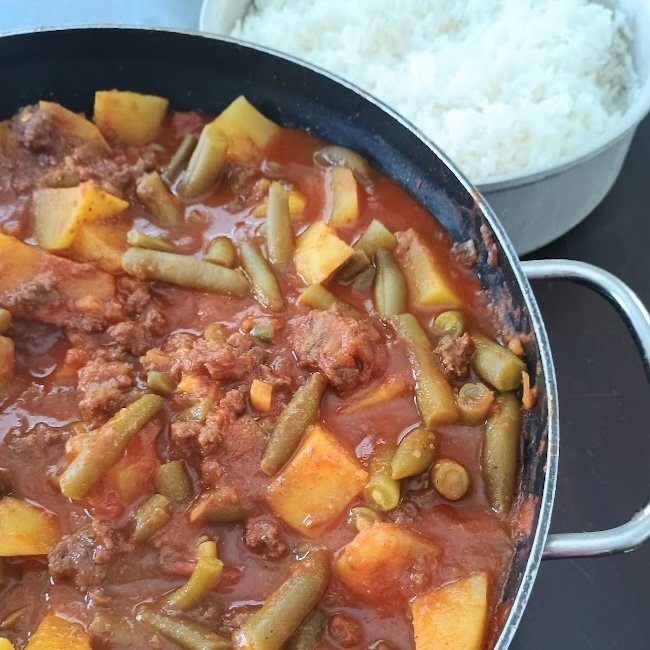 4. Stir in the crushed tomatoes and diced potatoes and mix well. Put a lid on and simmer, stirring occasionally, until the potatoes are tender. Add water as needed throughout cooking so that the mixture doesn’t get too thick (I fill the tomato can with water and usually end up using about half of it).