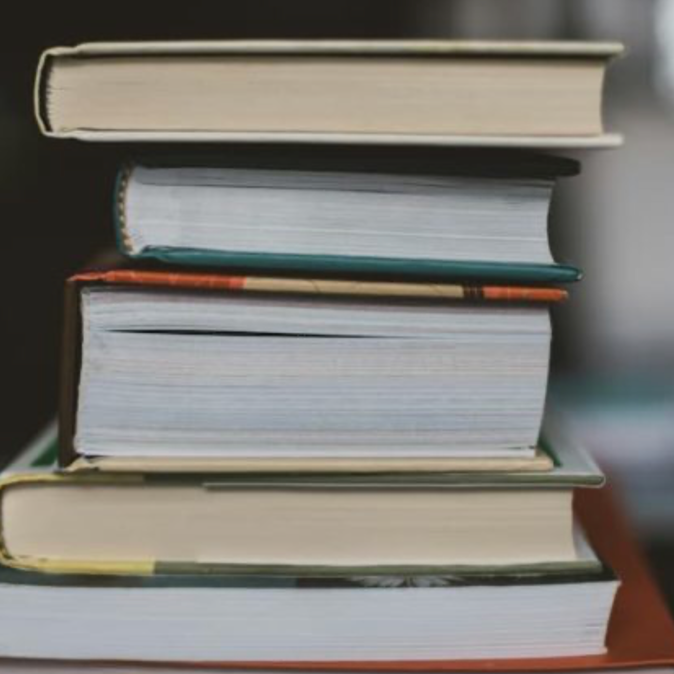 A stack of five books piled unevenly on top of each other with their pages facing outward.